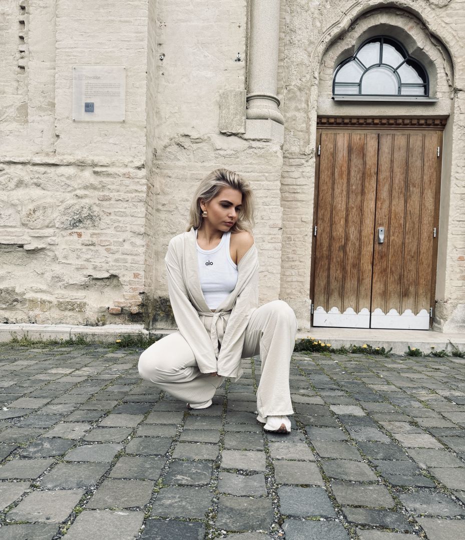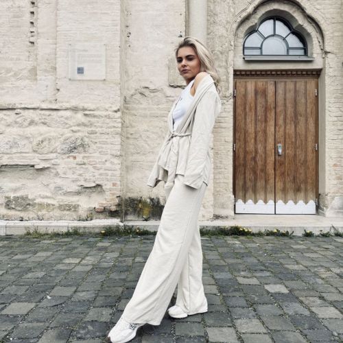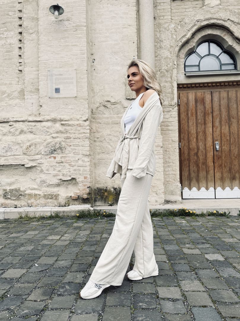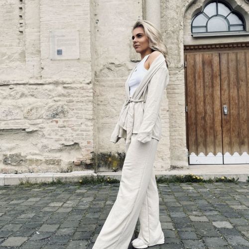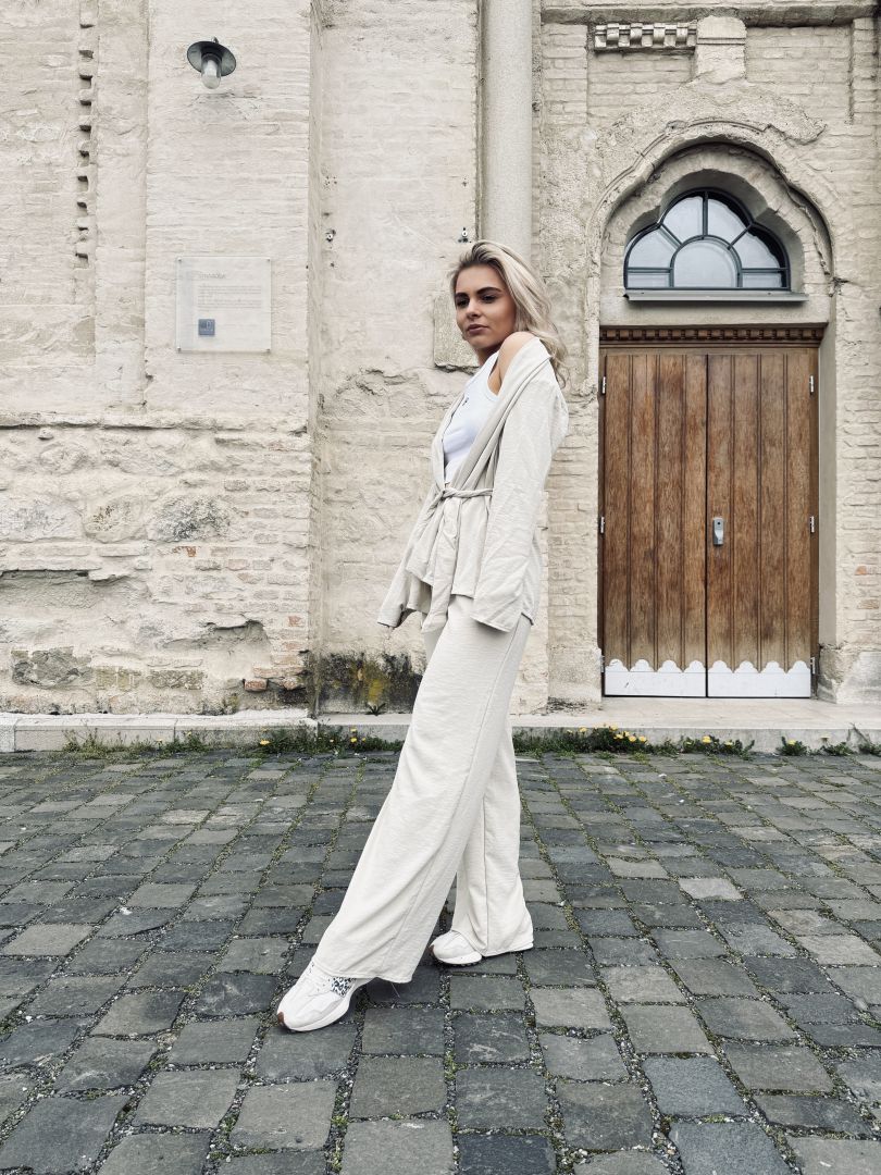 Kvalitne spracovaný komplet, vyrobený z príjemného a ľahučkého materiálu. Komplet sa skladá z nohavíc a prehozu. Prehoz má dlhý rozšírený rukáv a pohodlný voľný strih. Nohavice majú voľný strih, v páse sú doplnené gumou. Skvele kombinovateľný kúsok, ktorý sa hodí na letnú dovolenku ale aj na bežné nosenie