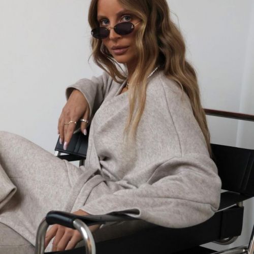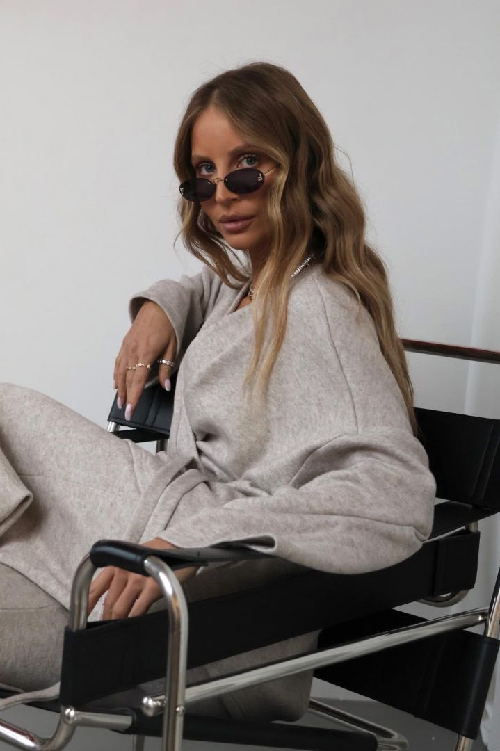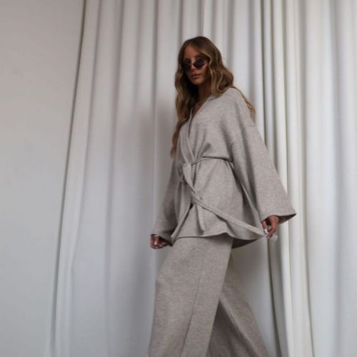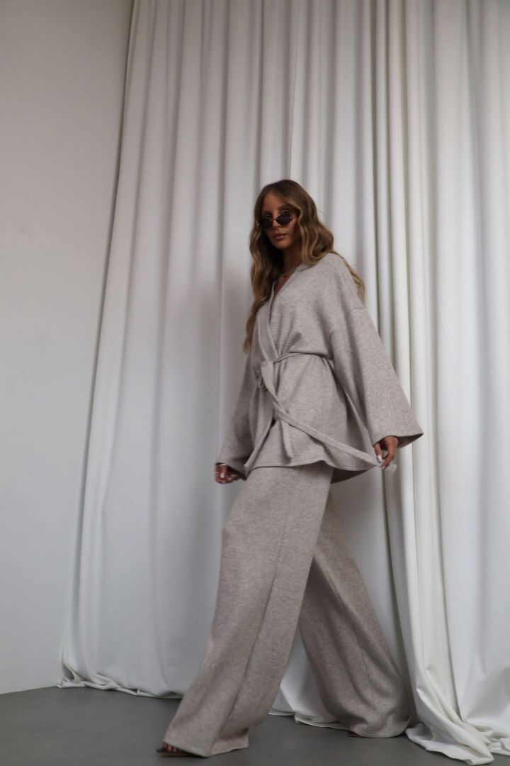 Tento štýlový komplet spája maximálne pohodlie s nadčasovou eleganciou. Nohavice z jemnej, priedušnej bavlny majú rozšírený strih, ktorý krásne predlžuje siluetu a dodáva outfitu ľahkosť a voľnosť. Sú navrhnuté tak, aby sedeli pohodlne po celý deň – ideálne na bežné nosenie aj voľnejšie pracovné dni. Komplet dopĺňa mäkký sveter na zaväzovanie, ktorý sa dá nosiť viacerými spôsobmi – uviazaný vpredu, ležérne prehodený alebo jemne zaviazaný nabok. Jeho hrejivá štruktúra a jemné textúry dodávajú outfitu ženský, modernosťou ladený charakter.