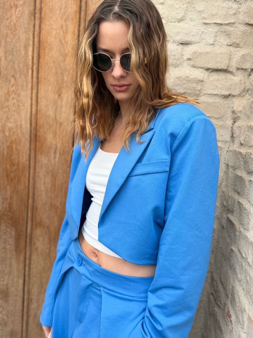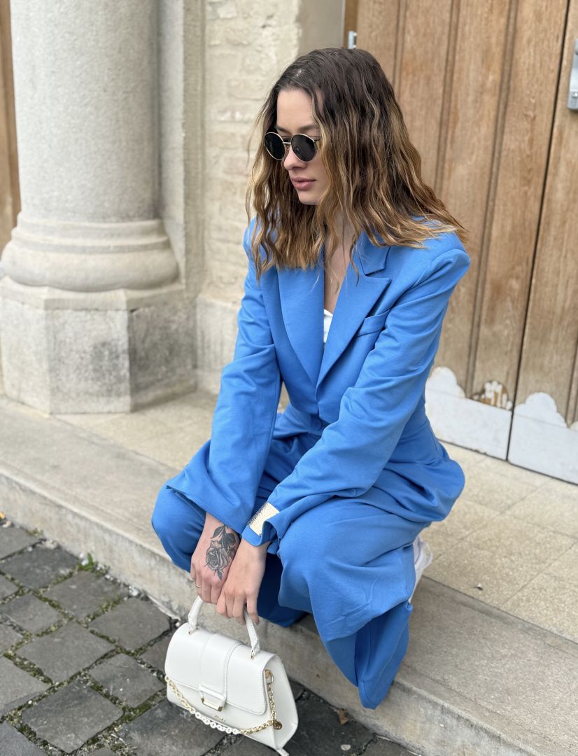 Komplet v modrom odtieni predstavuje dokonalú harmóniu štýlu a pohodlia. Sako s precízne tvarovaným strihom krásne zvýrazňuje siluetu a dodáva outfitu sofistikovaný nádych. Rozšírené nohavice s plynulým padnutím opticky predlžujú nohy a prinášajú do celkového vzhľadu ľahkosť a modernú eleganciu.