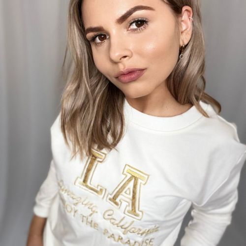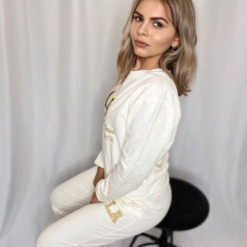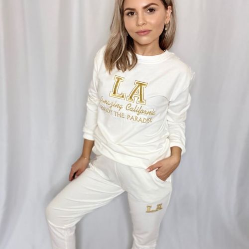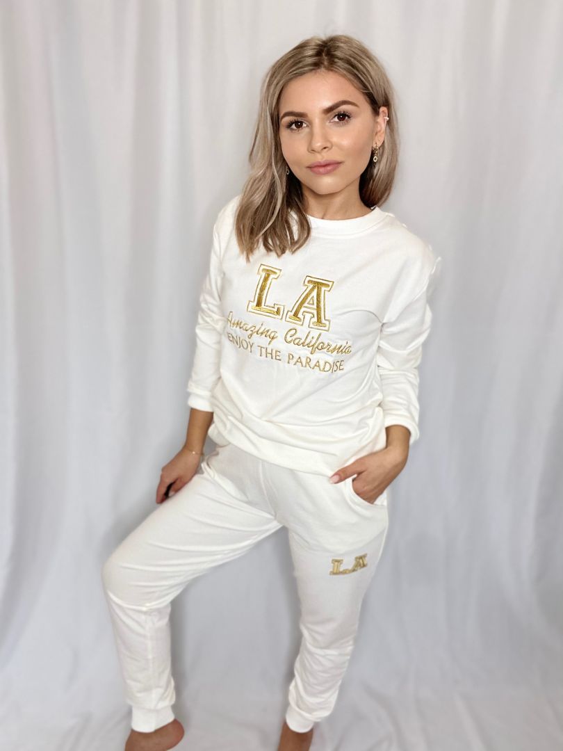 Tepláková súprava LA, white vám zabezpečí pohodlie a komfort, počas dní strávených doma alebo v prírode. Súprava má krásnu snehobielu farbu a je zdobená zlatým nápisom. Tepláky majú vrecká a sú zakončené gumičkou.