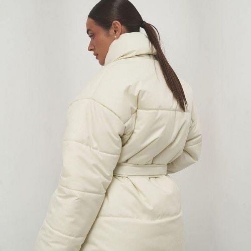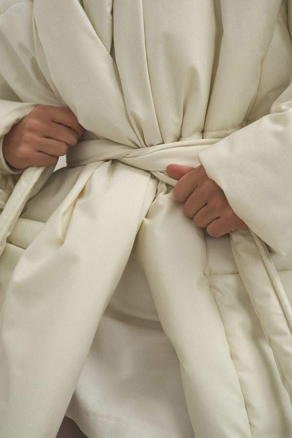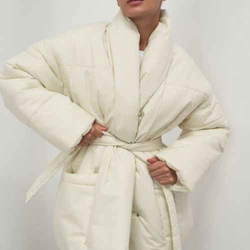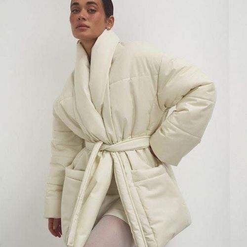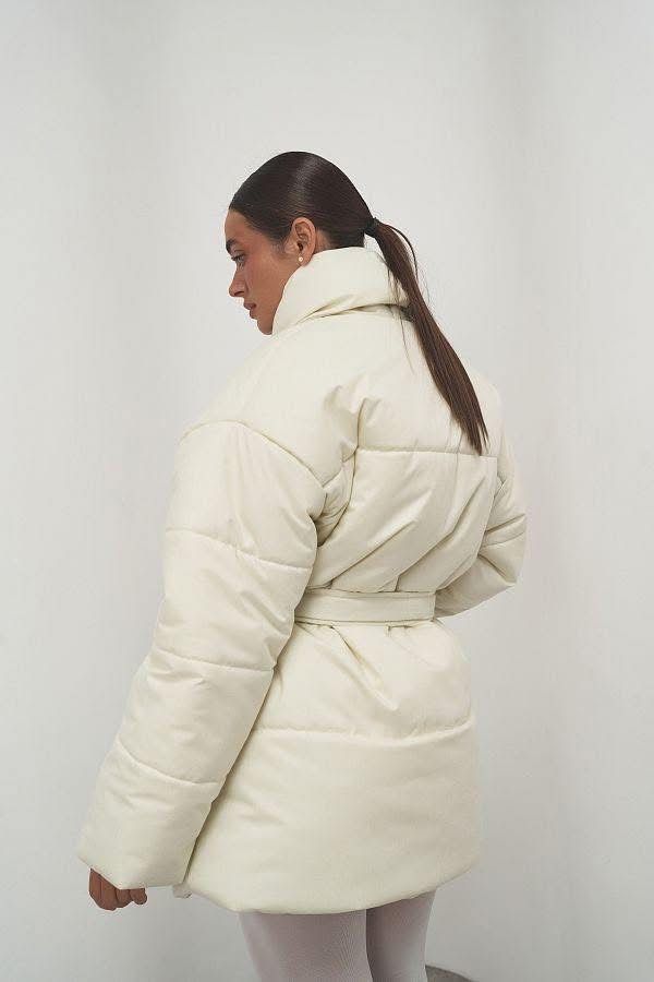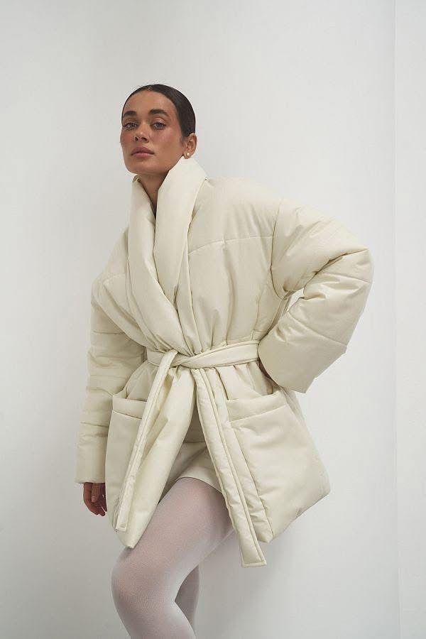 Krátka biela bunda, ktorá pôsobí moderne a štýlovo. Má čistý minimalistický dizajn, hladký povrch, ktorý dodáva outfitu sviežosť.
