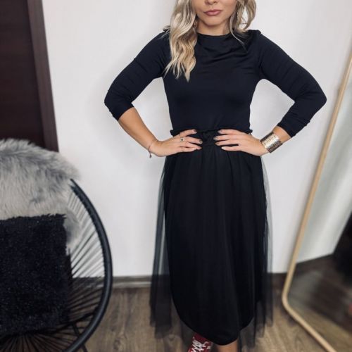 Táto dlhá čierna sukňa je stelesnením elegancie a všestrannosti. Jej bohatý, jemne splývavý materiál vytvára nádhernú siluetu, ktorá lichotí každej postave. Pás sukne je pohodlný a pružný, čo zaručuje dokonalý komfort a prispôsobivosť bez kompromisov v štýle. Je ideálnym doplnkom k jednoduchým blúzkam, tričkám, ale aj elegantným topom, takže vytvorí úžasný outfit na večeru, do práce či voľný čas. Táto čierna sukňa je jednoducho nevyhnutný kúsok šatníka každej ženy, ktorá hľadá univerzálny a zároveň pôsobivý módny doplnok.