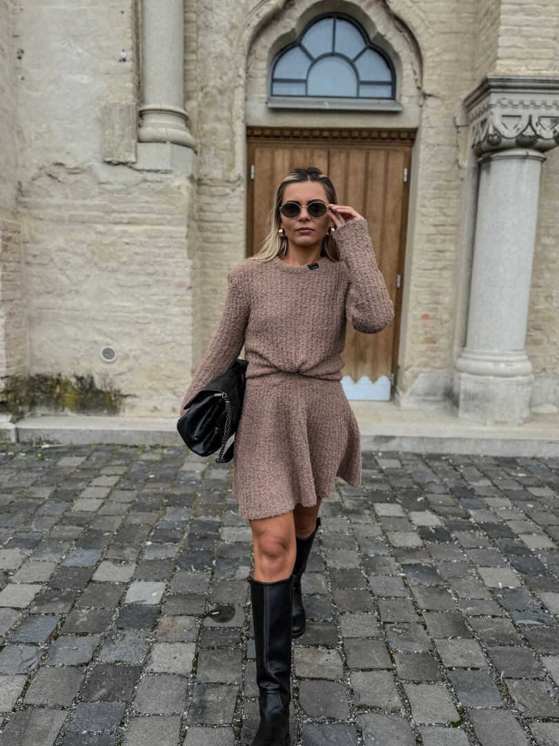 Nadčasový a zároveň moderný outfit, ktorý spája pohodlie s vkusom. Tento kvalitný dvojdielny komplet pozostáva z jemného, príjemného svetríka a perfektne padnúcej sukne v rovnakej farebnej línii. Mäkký úplet zabezpečí komfort počas celého dňa, zatiaľ čo rafinovaný strih lichotí postave.
