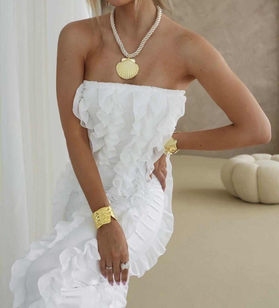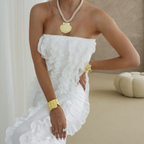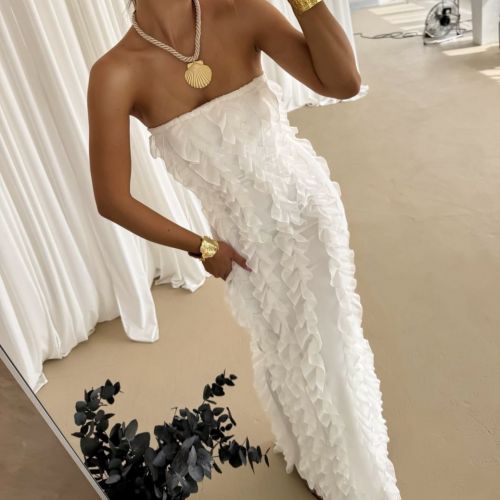 Tieto dlhé biele šaty s 3D volánovým efektom sú stelesnením ženskosti a štýlu. Bezramienkový strih jemne zvýrazní ramená a dekolt, zatiaľ čo textúrované detaily dodajú outfitu luxusný vzhľad. Perfektné na letné večery, oslavy alebo romantické chvíle.