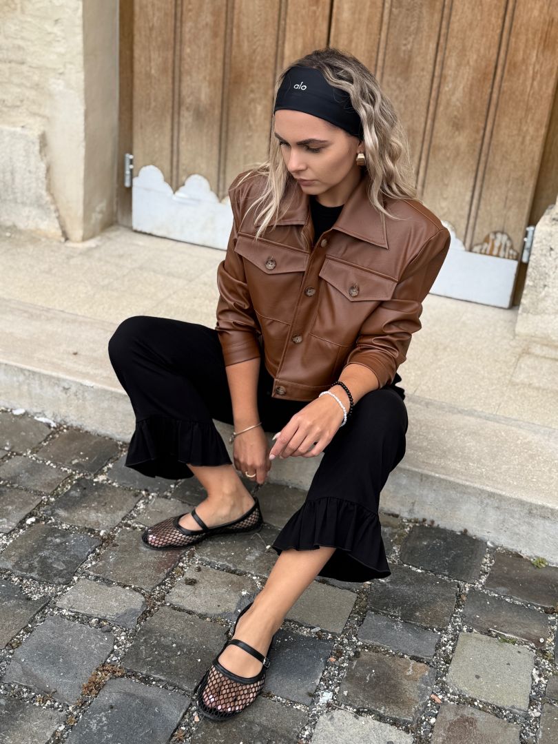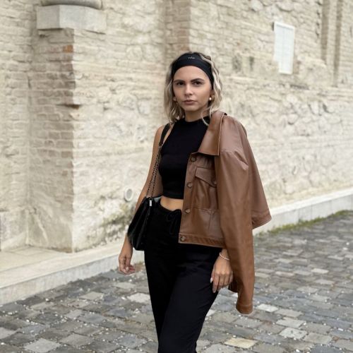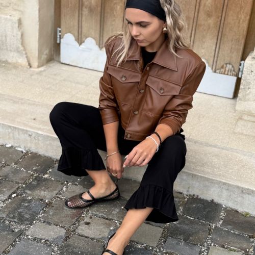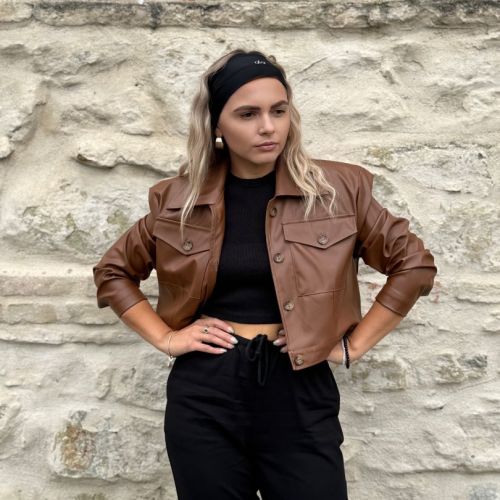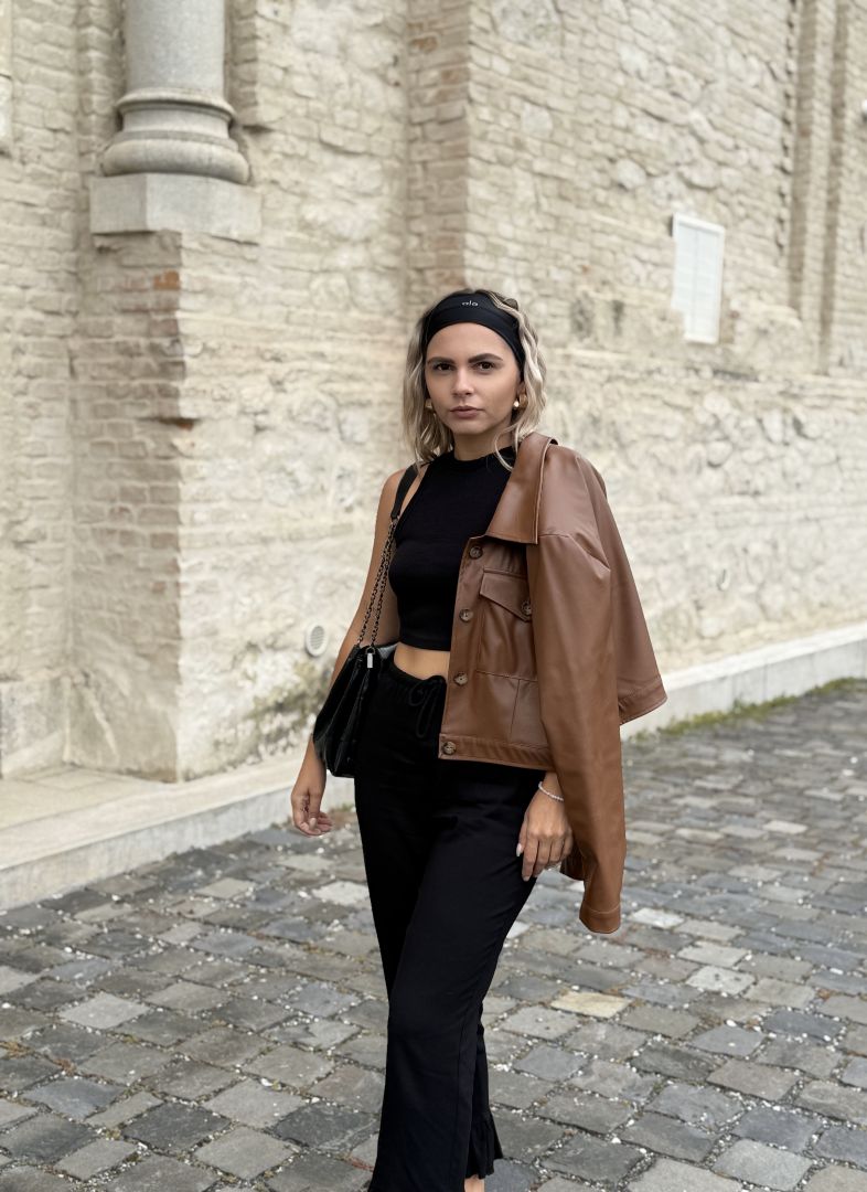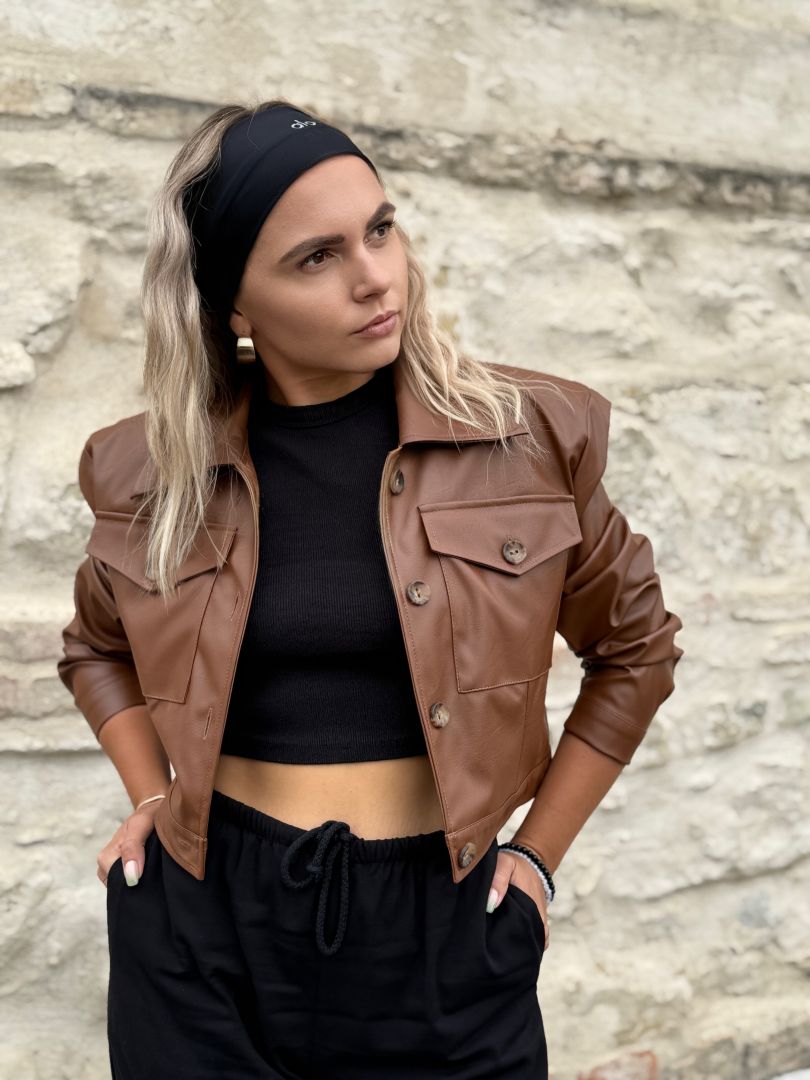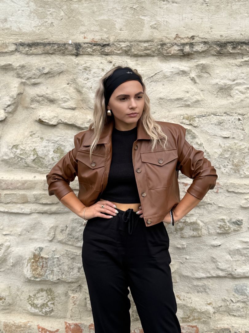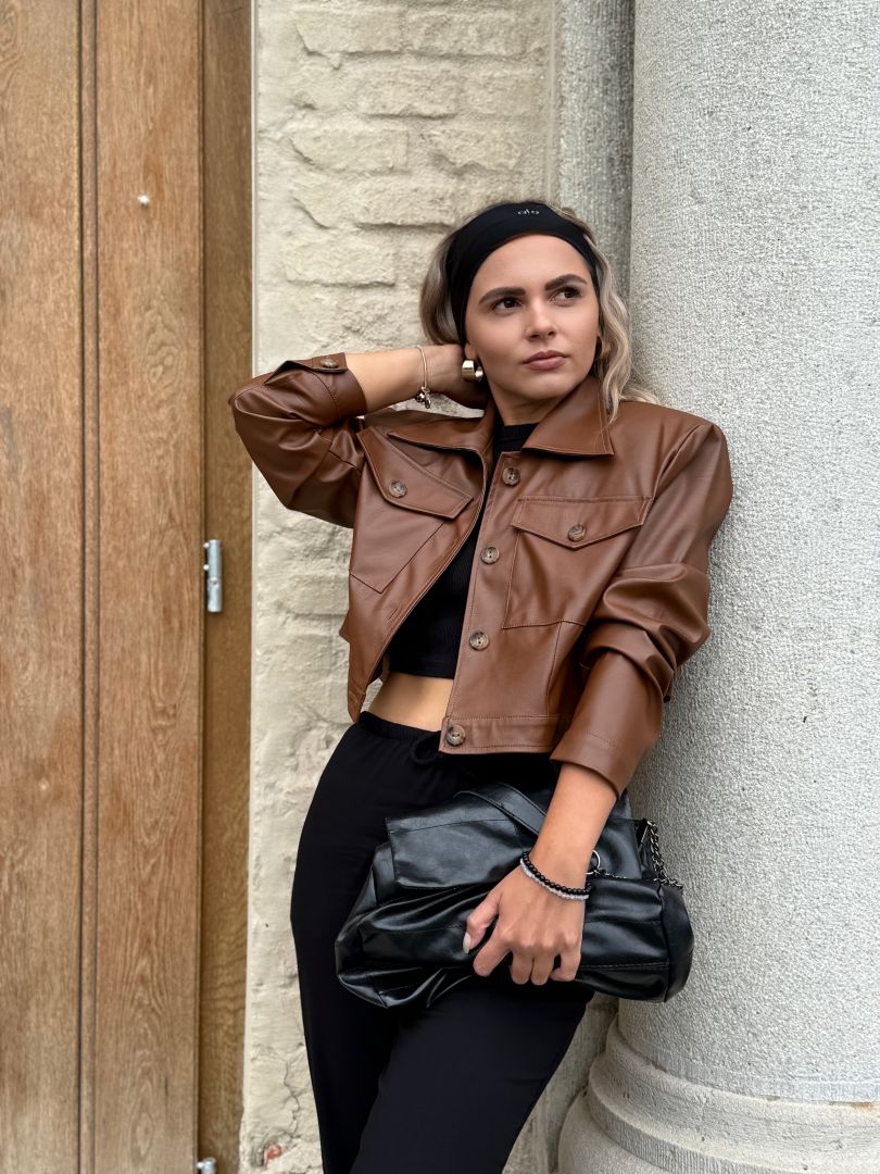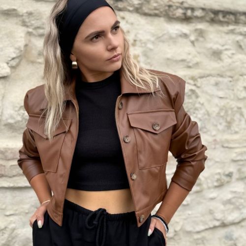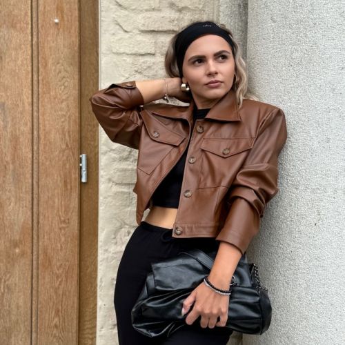 Štýlová krátka bunda z kvalitnej koženky značka Purpura. Oversize strih s výraznými vypchávkami na pleciach. Bunda sa zapína na gombíky. Podšitá jemnou podšívkou pre pohodlie a ľahké vrstvenie. Perfektný kúsok na prechodné obdobie, ktorý pozdvihne každý outfit.