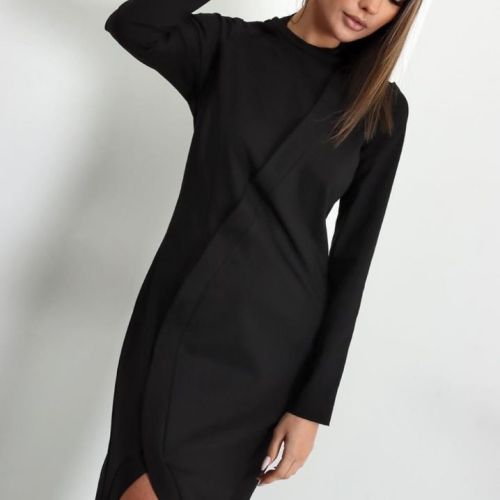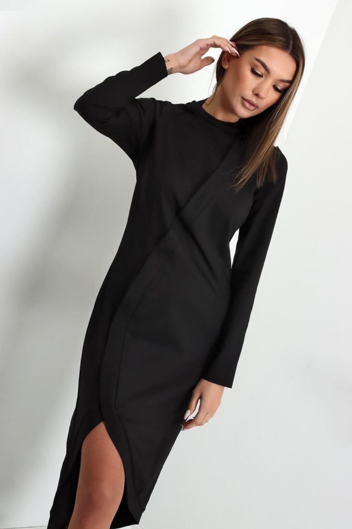 Nádherné šaty v čiernej farbe, vyrobené z príjemného materiálu sú ideálnou voľbou aj pre spoločenské udalosti. S elegantným strihom, ktorý krásne kopíruje postavu, tieto midi šaty s dlhým rukávom vás nechajú vyniknúť. Zapínanie na zips zo zadnej strany pridáva funkčný aj estetický rozmer.